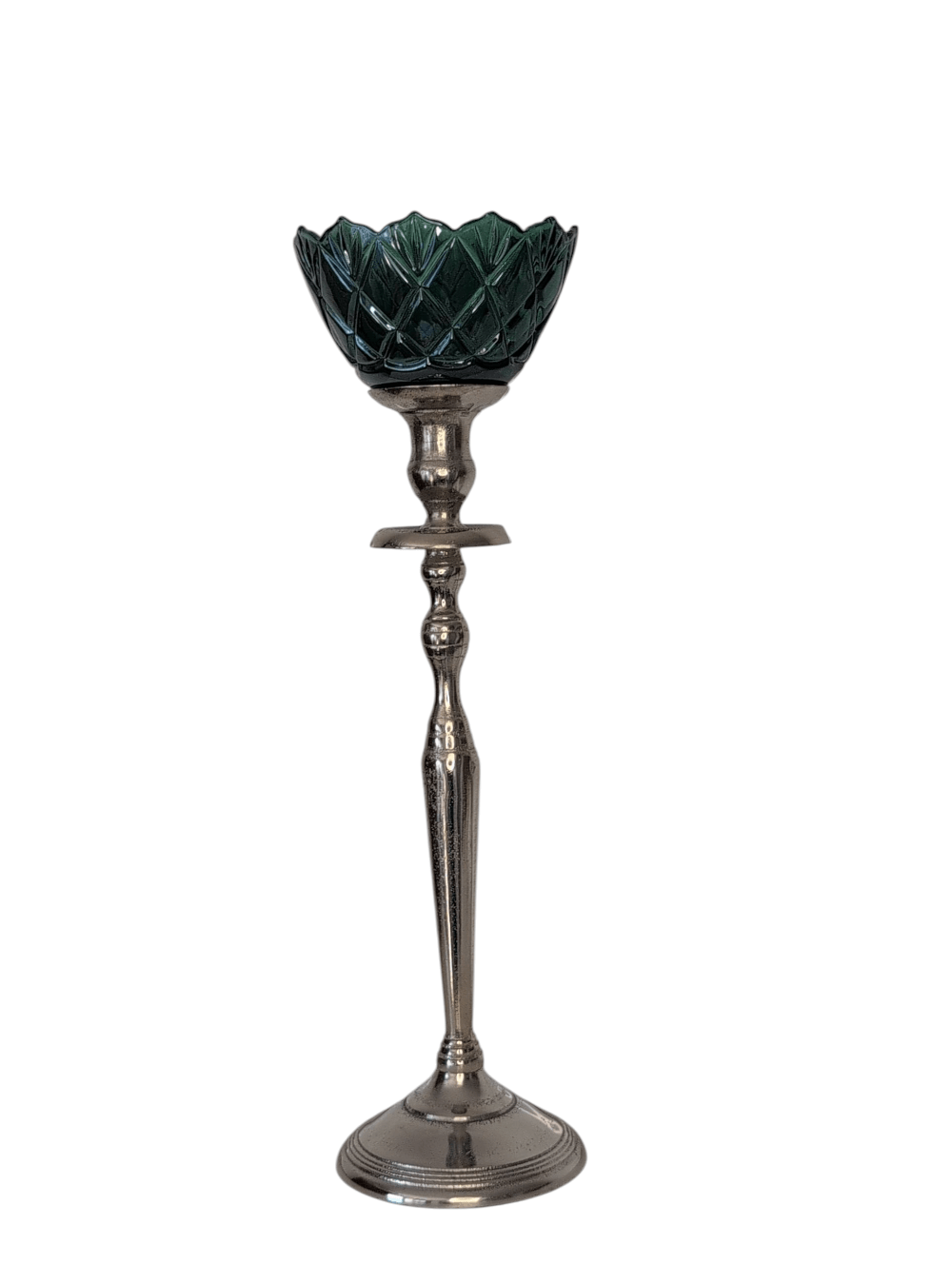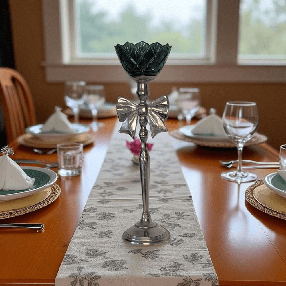Diese wunderschöne Schleife aus vernickeltem Aluminium in Silber-Antik verpasst jedem Tischdeko-Setup eine elegante Note. Die Schleife wird simpel zwischen einen bestehenden Leuchter eingesetzt: Oberteil des Leuchters abschrauben, Scheibe entnehmen, Schleife einsetzen, Oberteil wieder befestigen. Innerhalb weniger Schritte entsteht ein neuer Look, der sich besonders für mittlere oder große Leuchter eignet. Hinweis: Leuchter, Glas und übrige Deko nicht im Preis enthalten. Wir bieten ggf. passende Leuchter separat an.